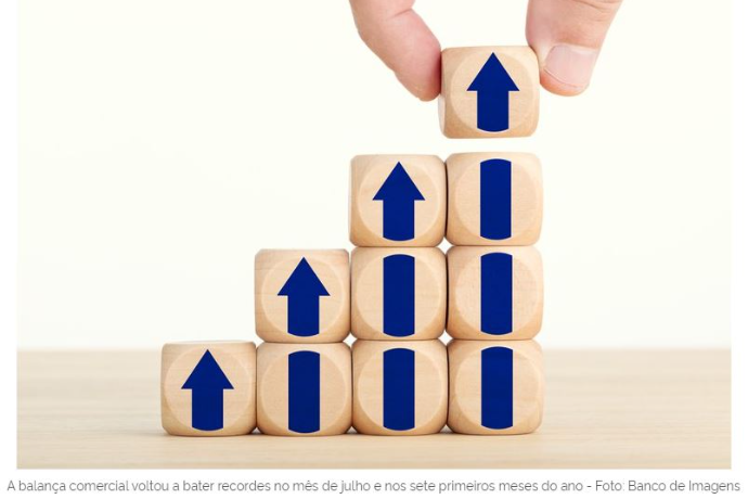 A balança comercial voltou a bater recordes no mês de julho e nos sete primeiros meses do ano. No acumulado de janeiro a julho as exportações cresceram 35,3% e somaram US$ 161,42 bilhões, enquanto as importações subiram 30,9% e totalizaram US$ 117,29 bilhões, na comparação com o mesmo período do ano passado. Assim, o Brasil registrou superávit de US$ 44,13 bilhões, em alta de 48,6%, e a corrente de comércio (soma das exportações e importações) subiu 33,4%, atingindo US$ 278,71 bilhões.